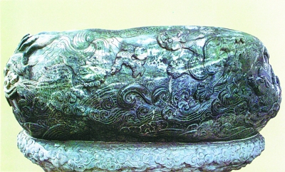 元代的玉雕在融合宋代世俗化和典雅的氣質(zhì)面貌外,也融合了蒙古族粗獷、古樸的藝術(shù)特色。這個時期的各種雕刻技法更加成熟,除浮雕、圓雕以外,還產(chǎn)生了多層次鏤空雕刻。1265年,元世祖忽必烈命工匠制成《瀆山大玉?!罚窃卮笮陀竦?,作為巨型酒器,意在反映元代國勢之強盛。玉雕下部的波浪采用了浮雕加陰線刻的雕刻技法,上部用陰線刻刻畫出翻騰的漩渦,四周刻有龍、鹿、豬、馬、犀等動物浮雕,形態(tài)各異,細致典雅,足見當(dāng)時玉雕工藝技藝高超。