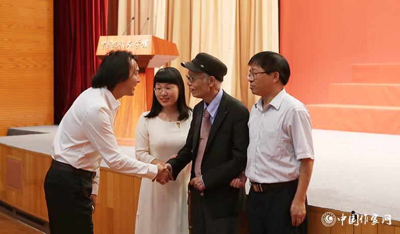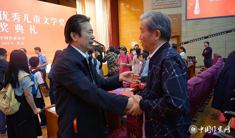 獲獎作家張煒、李少白在頒獎典禮結(jié)束后握手交談