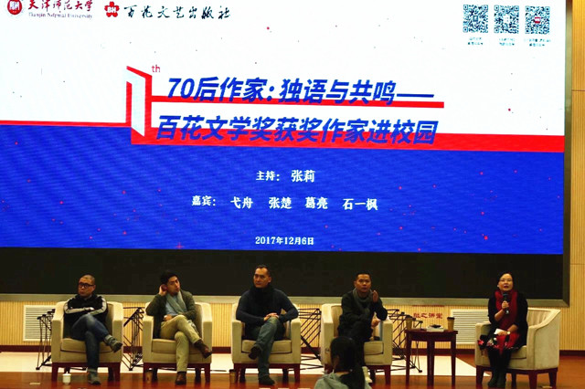 70后作家是一個不事喧嘩的堅實、成熟的群體,成長過程經(jīng)歷了改革開放前后不同的社會形態(tài),紛繁的變遷與涌動的思潮使他們對于自我和文學的認知都明顯不同于新時期作家和“80后”作家。無論詩歌、散文還是小說創(chuàng)作,70后作家都顯現(xiàn)出一種冷靜而沉郁的氣質(zhì),并表現(xiàn)出越來越強烈的時代關(guān)懷和現(xiàn)實書寫,積極探索個人敘事與時代精神的融通與契合,向著歷史與人性深處不斷掘進,成為青年作家的中堅力量。2017年12月6日,獲得第十七屆百花文學獎的四位70后作家葛亮、張楚、弋舟、石一楓走進天津師范大學,與在校師生進行了一場主題為“70后作家:獨語與共鳴”的對談,共同研討70后寫作者的精神際遇與美學追求,分享個人寫作歷程。對談由天津師范大學文學院教授張莉主持。