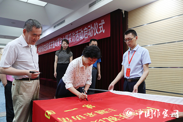 啟動儀式上,鐵凝向采訪團第一團授旗,采訪團第一團副團長阿來接旗。鐵凝、錢小芊等與參加啟動儀式的采訪團第一團部分作家合影留念,并分別在采訪團團旗上簽名。