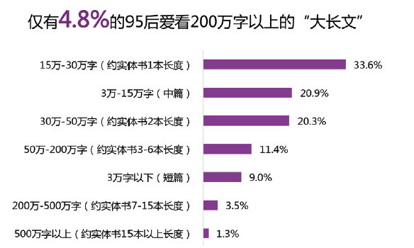 其次,輕量化的“小長文”漸成網(wǎng)絡文學主流。相比于紙質文學,網(wǎng)絡文學的一個突出特點便是“長”,曾幾何時,路遙長篇小說《平凡的世界》百萬字的篇幅已令很多 讀者望而生畏,然而如果將其放到網(wǎng)絡文學 領域,100 萬字或許只能算是“短篇”。其實,網(wǎng)絡文學的早期形態(tài)并不長,例如被譽為網(wǎng)文開山之作的《第一次親密接觸》(痞子蔡),其總長也不過 50 余萬??梢姡W(wǎng)文字數(shù)的長并不是“先天”的,從某種意義上說,它在很大程度上是由于資本的介入與網(wǎng)絡作家分成方式而導致的“注水”。那么,網(wǎng)文會持續(xù)“長”下去嗎?答案可能是否定 的,據(jù)統(tǒng)計(見圖 3),實際上僅有不足 5% 的Z世代人群愛看200萬字以上的“大長文”, 而相比之下,15—30 萬字的“小長文”成 為了“95 后”的最愛。顯然,“小長文”因 體量上的“輕”而更加適應年輕人細碎、零散的閱讀時間,當小長文迎合了 Z 世代的閱讀偏好,大長文一家獨大的地位便會漸漸喪失,輕量化的網(wǎng)絡文學成為主流之日便已然不遠。
