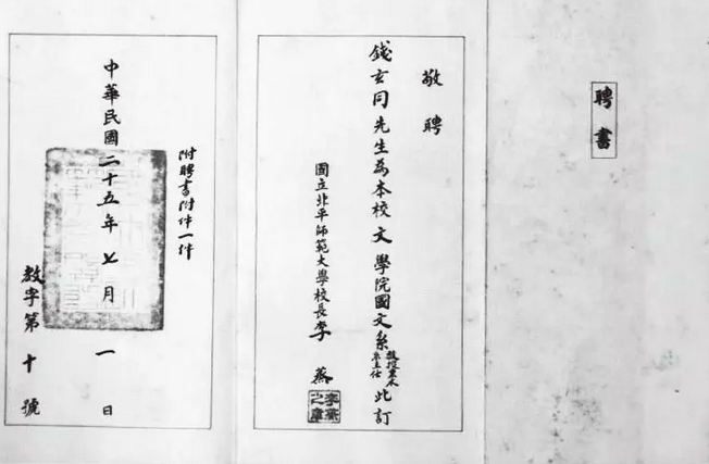 國(guó)立北平師范大學(xué)文學(xué)院國(guó)文系給錢玄同的聘書