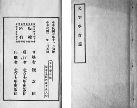 《文字學(xué)音篇》初版于1918年,由北京大學(xué)出版組出版,到1937年已出至第6版。1988年山西人民出版社出版的《錢玄同音學(xué)著作選輯》和1999 年中國(guó)人民大學(xué)出版的《錢玄同文集》第5卷都收錄了這部著作。在臺(tái)灣,1964年學(xué)生書局也重印過(guò)該書。