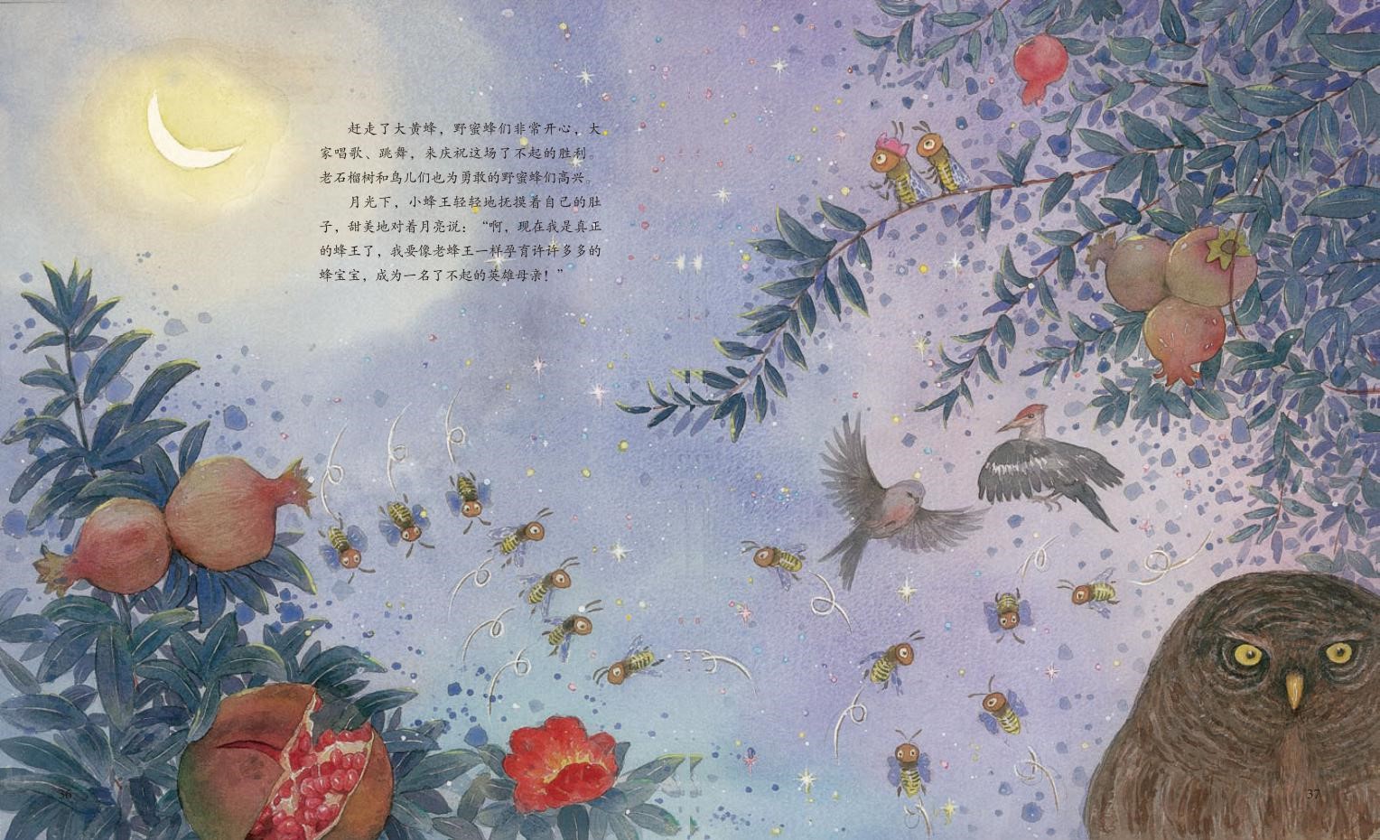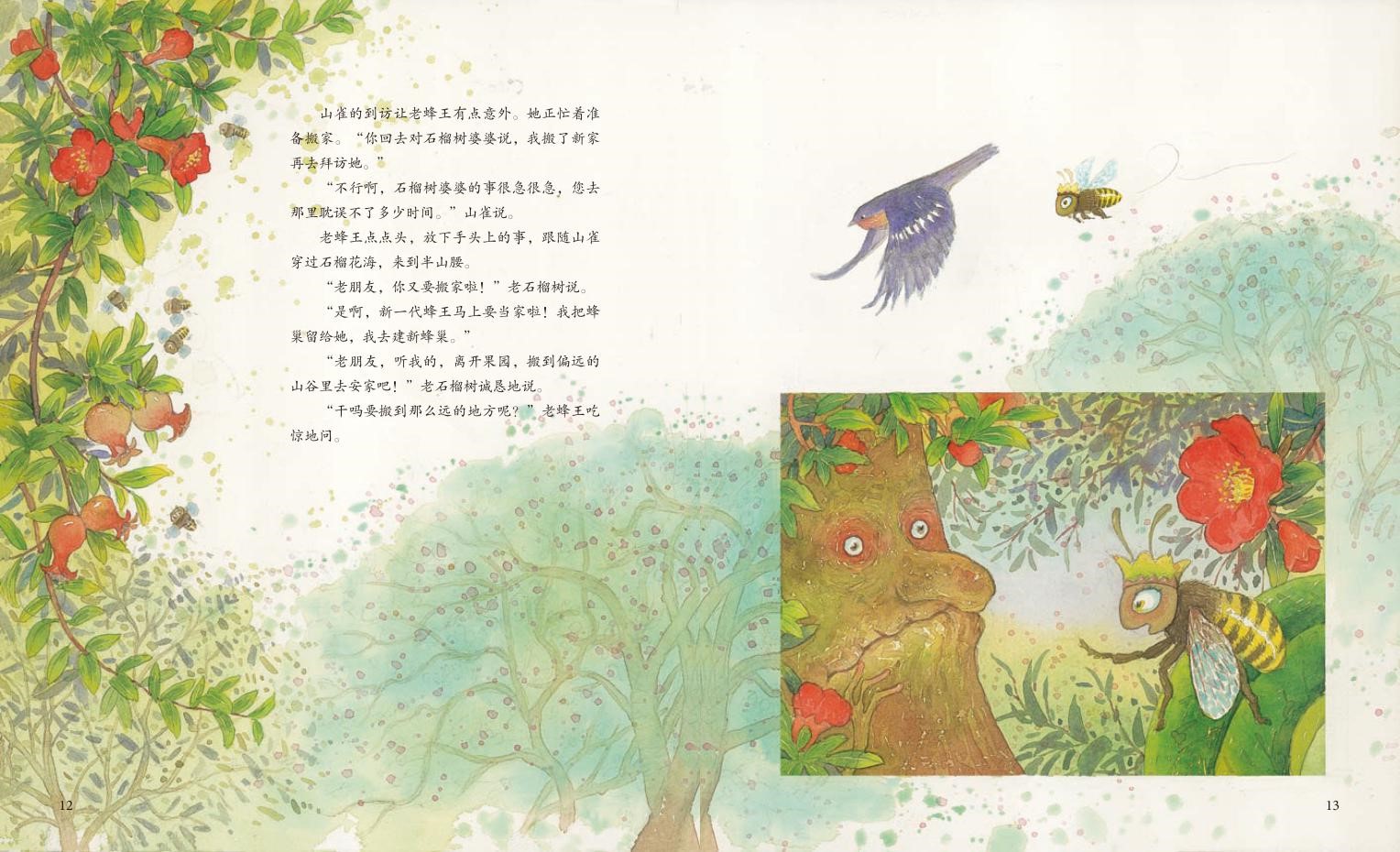 果園里的老石榴樹(shù)特別希望野蜜蜂家族能搬遷到遠(yuǎn)方的山谷去安家,繁衍后代。因?yàn)樗芮宄?,野蜜蜂家族變成弱群的原因。老蜂王沒(méi)有答應(yīng),她可不能在石榴樹(shù)開(kāi)花最需要授粉的時(shí)候離開(kāi)果園。當(dāng)年輕的蜂王誕生時(shí),野蜜蜂家族遭遇了外敵大黃蜂的襲擊。危難時(shí)刻,年輕有為的蜂王帶領(lǐng)蜂群加緊訓(xùn)練后與大黃蜂斗智斗勇,最終打敗敵人。在老蜂王的囑托下,年輕蜂王帶領(lǐng)新的蜂群飛向山谷……