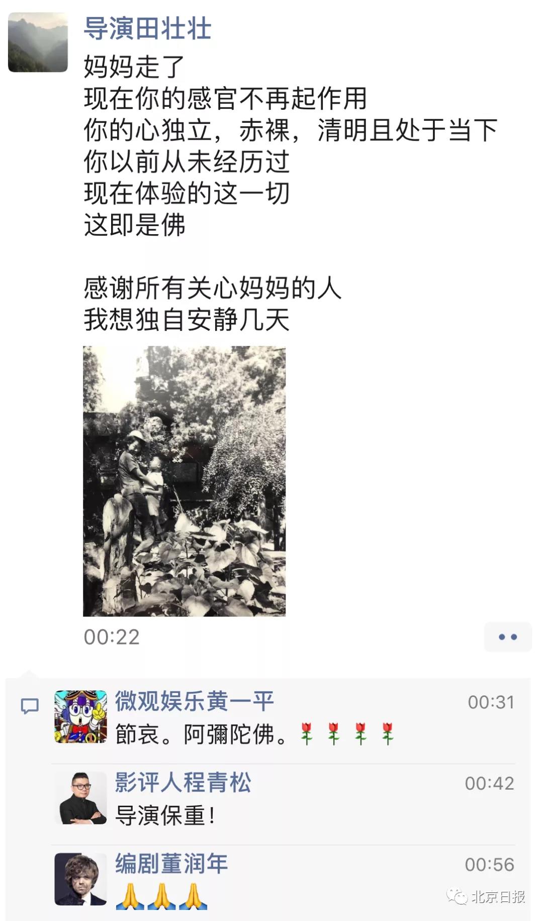 田壯壯導(dǎo)演在朋友圈寫道:感謝所有關(guān)心媽媽的人,我想獨(dú)自安靜幾天。