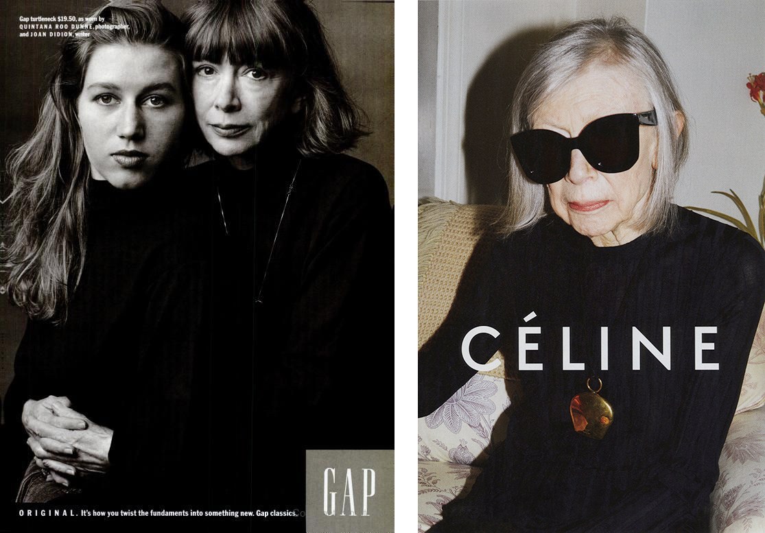 其實(shí),狄迪恩與時(shí)尚界的關(guān)聯(lián)很早就開(kāi)始了。21歲時(shí),她在Mademoiselle當(dāng)客座編輯,后在Vogue從業(yè)十年,她的穿衣風(fēng)格舉世稱(chēng)頌。她是Vogue的???,媒體甚至稱(chēng)她為“Céline女王”,因?yàn)樗?0歲高齡時(shí)親自為Céline代言。
