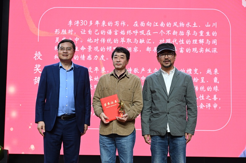 江南詩歌獎終評委、詩人、魯迅文學獎獲得者沈葦,永康市人大常委會副主任、陳亮研究會會長、詩人章錦水為李潯頒獎