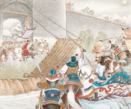 《西游記》是家喻戶曉的名著,也是每個(gè)中國(guó)孩子從小就接觸的,在展覽當(dāng)中就有描繪《西游記》精彩片段的繪本。《國(guó)粹戲劇書(shū)畫(huà)·大鬧天宮》將膾炙人口的京劇劇目《大鬧天宮》以一幅幅繽紛且具有東方神韻的畫(huà)面呈現(xiàn),來(lái)講述機(jī)智神勇的孫悟空不畏玉皇大帝強(qiáng)權(quán)、大戰(zhàn)天兵天將的故事。而在《俺老孫來(lái)也》里,則以更為現(xiàn)代、活潑的視角表達(dá)孫悟空的足智多謀。此外還有《清明上河圖十三郎》,將北宋名畫(huà)《清明上河圖》與《十三郎》的故事巧妙地融到一起,成為孩子對(duì)于名畫(huà)的興趣啟蒙。