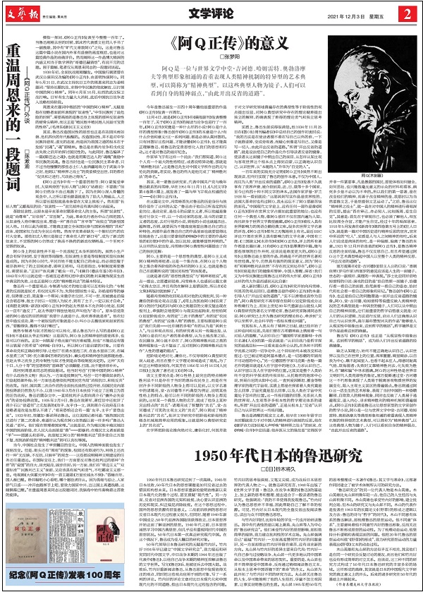12月4日,就是《阿Q正傳》在《晨報副刊》發(fā)表整整一百年了,關(guān)于《阿Q正傳》的閱讀與論爭也進行了一百年?!栋正傳》究竟是一種什么樣的小說?阿Q是什么樣的典型形象?魯迅創(chuàng)作《阿Q正傳》的本意是什么?有什么價值和意義?這一系列問題,都是必須認真回答的。只有回答好這些問題,才能讀懂《阿Q正傳》,也才能真正理解魯迅,將魯迅的寶貴思想化入我們的思想和行動。這才是對魯迅的最好紀念。