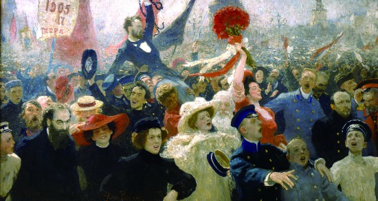 另一幅題為《1905年10月17日》的畫,表現(xiàn)一場俄國1905年民眾抗暴的革命場景,作者明言:“這里表現(xiàn)的是俄國社會解放”。畫上的師生和工人搖動紅旗歌唱,托舉一個“被赦免者”,歡呼他終獲自由。畫家這種渴望自由的情懷,于1903年在荷蘭灣海岸畫的《何等自由!》里已經(jīng)流露。那是一對男女青年在浪花中跳瑪祖卡舞,恰似一首青春的贊歌,在1905年革命潮流中愈顯熱情洋溢。這一現(xiàn)象表明,列賓雖然也為沙皇尼古拉二世和瓦爾瓦拉男爵夫人等顯貴畫過像,但他內(nèi)心始終是同情俄羅斯廣大窮苦大眾,支持革命者反抗暴君的。
