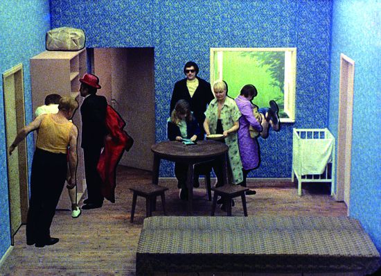 根據(jù)瑞比克金斯基的公司官網(wǎng)資料顯示,為了創(chuàng)作《探戈》,他花費了大量精力進行人工逐幀處理——手動摳像,再手動合成。這難免會使這部短片的視覺效果有一定瑕疵。瑞比克金斯基自己坦言,人物周圍有可見的黑色邊線,膠片材料的不穩(wěn)定也導(dǎo)致了抖動,燈光色溫的波動影響了顏色的統(tǒng)一。為了讓36個人的行動軌跡在狹小的房間里互不影響,瑞比克金斯基對人物的姿態(tài)序列在時間軸上進行了微調(diào),于是《探戈》最后呈現(xiàn)出角色動態(tài)有時略快、有時略慢的狀況。也正因為這個原因,雖然筆者更愿意將其歸為以實拍為基底的作品,但畢竟它踩在了動畫與實拍兩種影像類別的邊線上——瑞比克金斯基自己甚至將其稱作“實拍動畫”(live action animation)這種怪名字——因此在這里我們不妨以動畫視角來審視該短片。