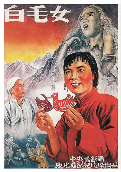 電影《白毛女》海報由享有“海報泰斗”之譽的顏地先生繪制,是一幅水粉畫。海報對比鮮明,濃縮了影片精華。畫面前景為暖色調(diào),喜兒身穿紅色棉襖、手拿自己剪的一對紅色鴛鴦窗花,紅潤的臉龐笑容洋溢,還有一頭烏黑亮麗的秀發(fā),整個人活潑可愛。背景則為冷色調(diào),從雪山洞窟出來的“白毛仙姑”披頭散發(fā),雙手回抱在肩,口張大、眉頭緊鎖,表情痛苦。冷色調(diào)與暖色調(diào)、黑頭發(fā)與白頭發(fā)、可愛與恐怖,這種對比的手法,深刻揭示出“舊社會把人逼成‘鬼’,新社會把‘鬼’變成人”的主題,給觀眾留下強烈的心靈震撼。