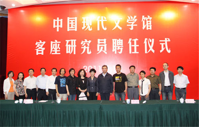 2011年5月19日,李云雷、張莉、房偉、楊慶祥、周立民、梁鴻、霍俊明七人獲聘中國現(xiàn)代文學(xué)館首屆客座研究員。周立民(右五)在現(xiàn)場。