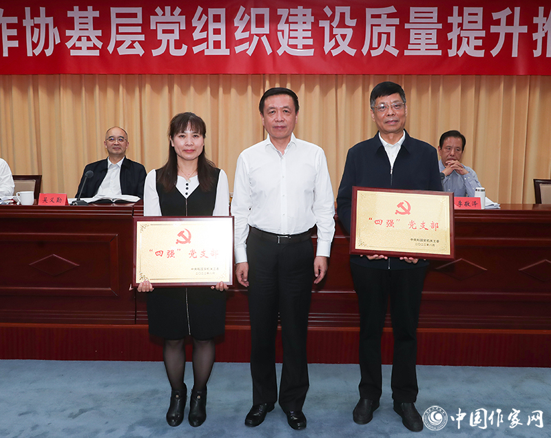 會議為獲得中央和國家機關(guān)“四強”黨支部稱號的中國作協(xié)辦公廳黨支部、作家出版社有限公司第二黨支部頒授獎牌,為獲得全國“人民滿意的公務(wù)員”的外聯(lián)部王婉同志頒授證書、獎?wù)?。中國作協(xié)辦公廳黨支部書記李一鳴、作家出版社有限公司第二黨支部書記王麗勇、魯迅文學(xué)院黨支部書記徐可、民族文學(xué)雜志社黨支部書記石一寧等4位同志作了交流發(fā)言。