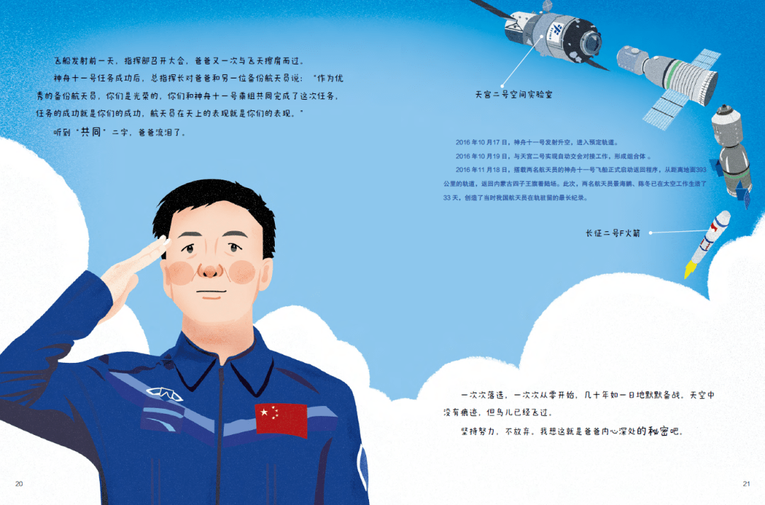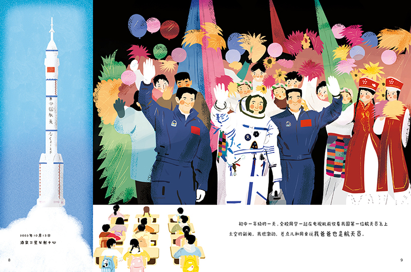 中國(guó)作家網(wǎng):您和鄧清明的女兒鄧滿琪同為90后,在創(chuàng)作繪本時(shí)一定很有代入感吧!能談?wù)勀?dāng)時(shí)的創(chuàng)作心態(tài)嗎?另外兩本父親系列的繪本里,父親最后都實(shí)現(xiàn)了自己的夢(mèng)想,而《爸爸的秘密》的結(jié)尾則是開(kāi)放式的。如今鄧清明航天員已經(jīng)圓夢(mèng),您一定有很多感慨吧!能分享一下嗎?