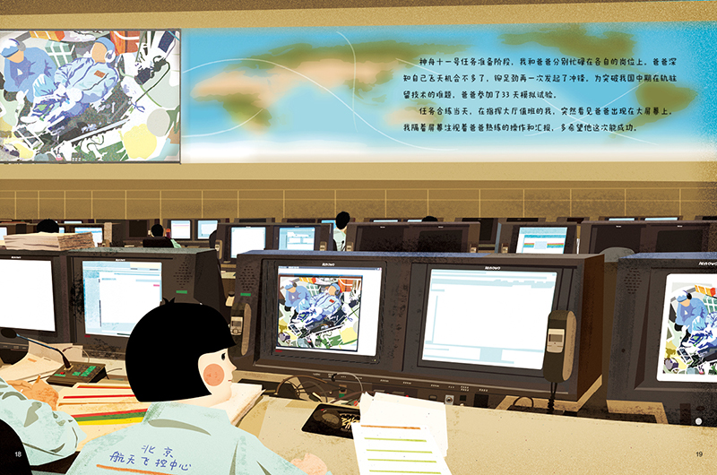 趙墨染:2016年我在清華美院讀書(shū)的時(shí)候選擇做科普繪本的研究,有了一些科普繪本的創(chuàng)作經(jīng)驗(yàn)。2018年中國(guó)少年兒童新聞出版總社的唐威麗老師聯(lián)系到我說(shuō)有這樣一個(gè)航天員的故事,問(wèn)我感不感興趣。本身我對(duì)航天題材也很感興趣,看了鄧清明父女《朗讀者》的節(jié)目后,被深深地打動(dòng)了。之后在出版社的安排下我和鄧清明的女兒滿琪見(jiàn)面了,自此開(kāi)始了我們?nèi)甑膭?chuàng)作之旅。這三年我們線上線下溝通了多次,她給我提供了非常詳盡的資料。比如故事的腳本,相關(guān)的影像資料,參考書(shū)籍、電影和紀(jì)錄片等等。從文字到分鏡圖再到正稿,滿琪很認(rèn)真地校對(duì)每一處。因?yàn)樗鳛楹教烊说膶I(yè)背景,有她在我會(huì)很踏實(shí)。說(shuō)到印象最深的瞬間是神舟十一號(hào)任務(wù)準(zhǔn)備階段,滿琪在指揮大廳值班看到爸爸出現(xiàn)在大屏上,她眼含淚水的樣子讓我難忘。