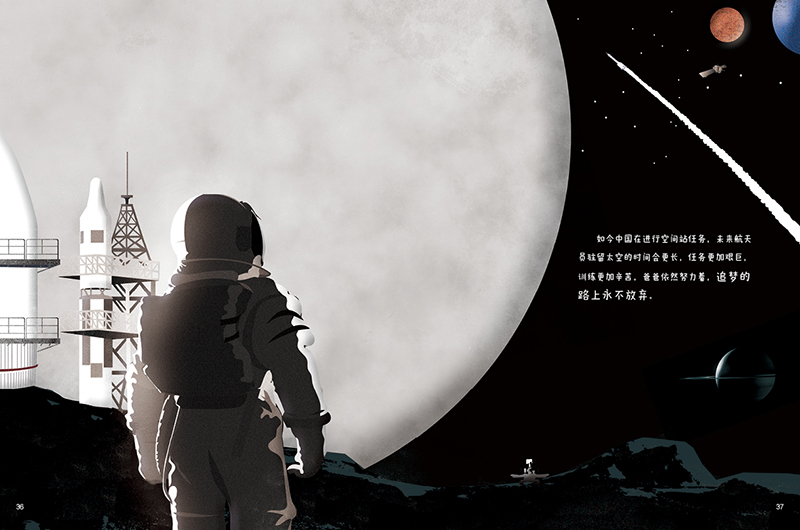 趙墨染:科普類型的繪本創(chuàng)作更需要大量的資料研究和科學(xué)求真的精神。盡可能多看資料,多去實(shí)地考察。就怕創(chuàng)作時(shí)需要畫(huà),卻沒(méi)有素材可參考。要在有限的體量?jī)?nèi),講清楚想表達(dá)的故事,對(duì)資料的分類整理必不可少。如何將這些素材編輯好,講好這個(gè)故事也是研究重點(diǎn)。比如一開(kāi)始做《爸爸的秘密》這本書(shū),書(shū)中涉及航天專業(yè)知識(shí)的圖形化對(duì)我來(lái)說(shuō)確實(shí)是個(gè)難關(guān),但隨著創(chuàng)作的深入,資料收集越來(lái)越充分時(shí),我開(kāi)竅了,也得心應(yīng)手起來(lái)。關(guān)于航天員訓(xùn)練、中國(guó)航天大事記、航天器等畫(huà)面我運(yùn)用了視覺(jué)傳達(dá)設(shè)計(jì)中的信息圖表的方法,按照時(shí)間線分類以及做兒童喜歡的圖形化的設(shè)計(jì),在排版上注意圖文的關(guān)系,讓讀者更清晰地了解這些科普知識(shí)。總結(jié)而言是對(duì)內(nèi)容的理性梳理和感性呈現(xiàn)。