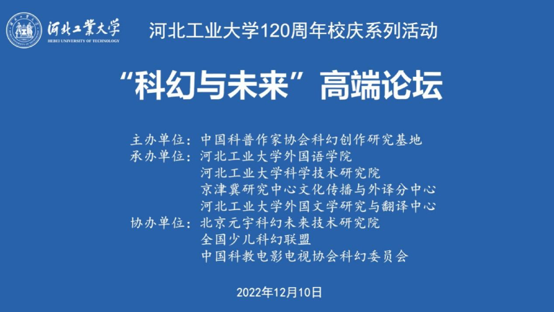 為繁榮科幻創(chuàng)作、發(fā)展科幻事業(yè)、激發(fā)全民族創(chuàng)新創(chuàng)造活力、提升全民科學素質(zhì),同時促進科學技術普及和科幻事業(yè)與產(chǎn)業(yè)發(fā)展,為支撐服務經(jīng)濟社會發(fā)展服務,12月10日下午,河北工業(yè)大學120周年校慶系列活動“科幻與未來”高端論壇以線上會議的形式成功舉辦。論壇邀請科幻創(chuàng)作與科幻產(chǎn)業(yè)研究領域的十余位作家、學者就“科幻與未來”這一主題展開探討,共同暢談科幻發(fā)展。