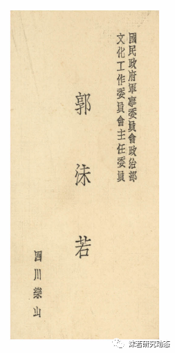 郭沫若紀(jì)念館藏有一張郭沫若的名片,豎行繁體字:右上臺頭兩行作“國民政府軍事委員會政治部文化工作委員會主任委員”,中間為姓名,清楚地印著“郭沬若”,左下角文字為“四川樂山”(見圖片)。