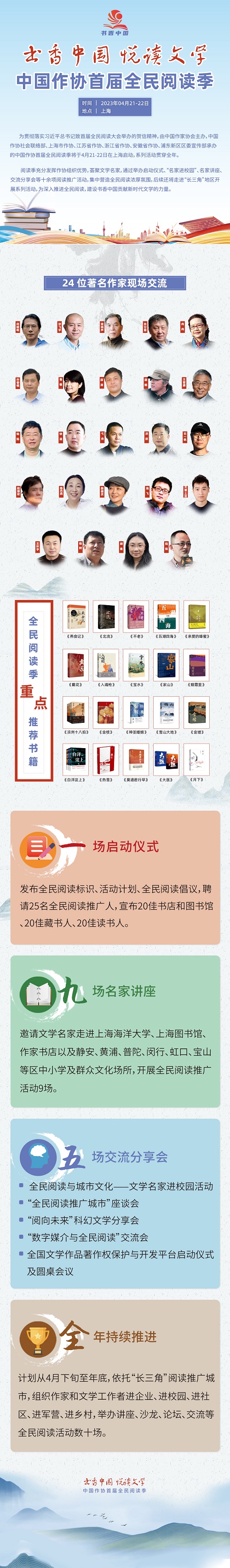 由中國作家協(xié)會主辦,中國作協(xié)社會聯(lián)絡(luò)部、上海市作家協(xié)會、江蘇省作家協(xié)會、浙江省作家協(xié)會、安徽省作家協(xié)會、浦東新區(qū)區(qū)委宣傳部承辦的中國作協(xié)首屆全民閱讀季將于4月21-22日在上海啟動(dòng),系列活動(dòng)將貫穿全年。