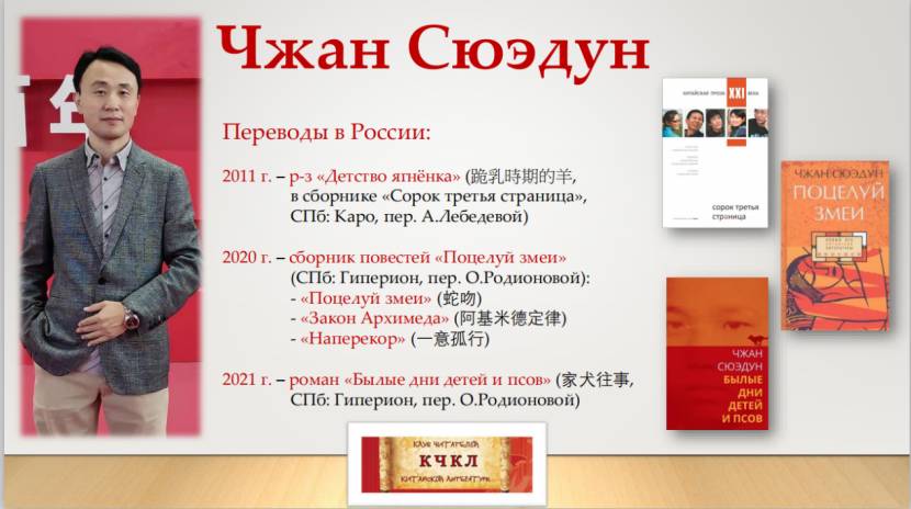 張學東生于1972年,現(xiàn)為寧夏作家協(xié)會副主席,其創(chuàng)作的長篇小說《家犬往事》、中篇小說集《蛇吻》和短篇小說《跪乳時期的羊》已分別由圣彼得堡大學漢學家羅季奧諾娃、列別捷娃譯成俄文出版。通過俱樂部活動,相關作品得到了俄羅斯中國文學愛好者的廣泛關注和討論。