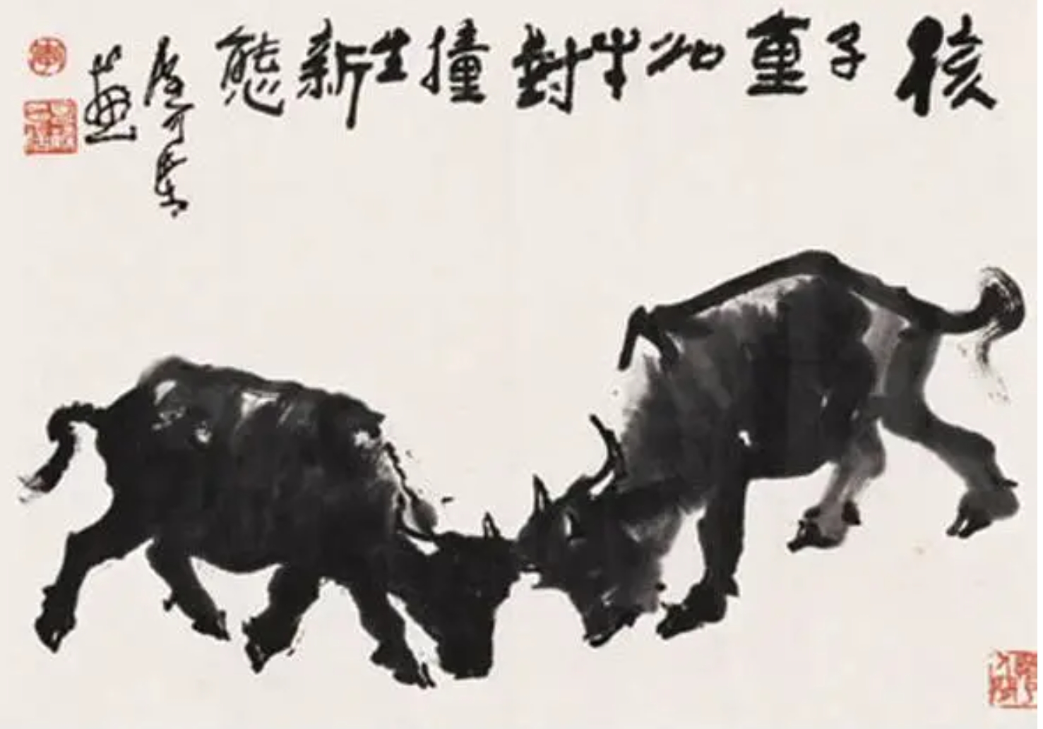 1989年5月,中國高等科學(xué)技術(shù)中心召開《場、弦和量子引力》國際學(xué)術(shù)研討會,李政道邀請到了李可染作主題畫,李可染畫出了一幅《超弦生萬象》,后來在1989年6月,又為《相對論性重離子碰撞》國際學(xué)術(shù)研討會,畫出了一幅《核子重如牛,對撞生新態(tài)》,畫的是兩頭壯實的公牛肌肉緊繃,拼出了所有力氣,低頭對撞。李可染先生曾經(jīng)畫遍了層林盡染,滿山紅遍,表現(xiàn)出無限風(fēng)光盡收眼底的瀟灑與展括,但在畫完這幅雙牛對撞之后,卻是氣喘吁吁,連說太累了,太累了。他是在牛的對撞之間,感受到巨大而又猛烈的風(fēng)馳電掣千鈞之力。正負(fù)電子就像兩匹高速奔跑的牛,死命地撞向?qū)Ψ剑呦嘤龅囊粍x那,如電閃雷鳴,火花四濺,就在這些像焰火一般四射的碎片中,科學(xué)家從中捕捉到可能從未發(fā)現(xiàn)過的物質(zhì)。