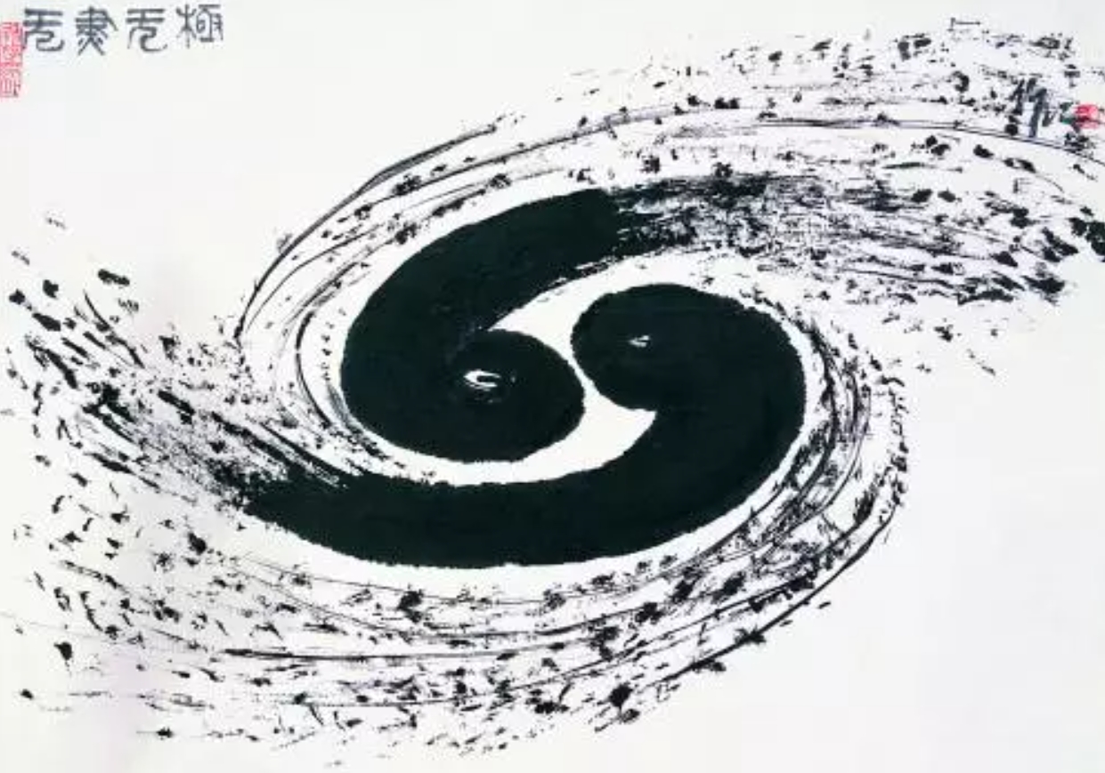 1988年在舉辦《二維強(qiáng)關(guān)聯(lián)電子系統(tǒng)》國際學(xué)術(shù)研討會時,李政道請來了吳作人先生,大師心領(lǐng)神會,運用中國古代哲學(xué)的觀念,認(rèn)為所有的復(fù)雜性都是從簡單性產(chǎn)生的,正如李政道先生特別喜愛的老子《道德經(jīng)》中所言“道生一,一生二,二生三,三生萬物?!钡?,如何從簡單到復(fù)雜的呢?通過科學(xué)實驗人們得知,正負(fù)電的粒子之間的相互作用,形成了原子分子以至世界萬物。正負(fù)兩極的對偶結(jié)構(gòu),在中國古代哲學(xué)里稱之為“陰陽”,太極符號表現(xiàn)的就是陰陽之間的關(guān)系。吳作人就此畫了一幅變形太極圖《無盡無極》,他揮灑筆墨,心連天宇,兩道反向交織又指向無邊境界的力與光,浩浩淼淼,飄然而又無所不及。