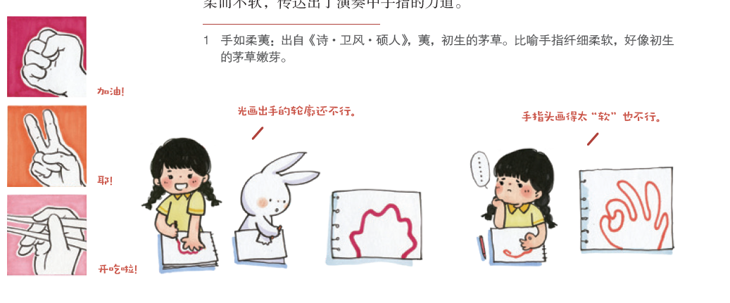 圍繞畫作講解,書中還設(shè)置了“畫里有話”板塊,對一些與中國畫相關(guān)的概念、歷史文化知識展開介紹,同時,對書里出現(xiàn)的生僻字詞,都標注了拼音。為了增加閱讀趣味,書中還結(jié)合畫作講解,設(shè)置了一些互動小游戲,幫助讀者輕松開啟藝術(shù)大門。《狀貌寫神的人物畫》中賞析《吹簫仕女圖》時,延伸講到“畫人難畫手”,讓讀者動手實踐畫手的難度。