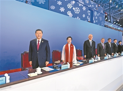 19時(shí)58分,在《和平——命運(yùn)共同體》的樂曲聲中,習(xí)近平和夫人彭麗媛,同國際奧委會(huì)主席巴赫、亞奧理事會(huì)第一副主席霍震霆等步入主席臺(tái),向觀眾揮手致意。全場(chǎng)響起長(zhǎng)時(shí)間的熱烈掌聲。