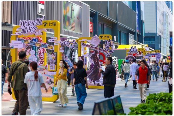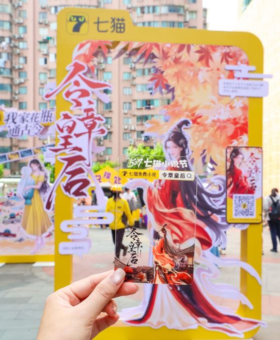 5月24日,21位網(wǎng)文作家從全國各地來到上海,在五角場萬達廣場舉辦的“527七貓小說節(jié)”大神作家見面會上與書迷面對面交流。當寫故事的人從屏幕后走到臺前,現(xiàn)場笑聲與歡呼聲不斷。巡游環(huán)節(jié),多位裝扮成小說人物的coser與書迷熱情互動,“紙片人”破次元來到現(xiàn)實中。小說節(jié)打卡手冊、限定款帆布包、冰箱貼、透卡成為“搶手貨”,吸睛的“七貓黃”席卷五角場。這一數(shù)字閱讀行業(yè)首個線上線下結合的品牌節(jié)日,為商圈帶來嘉年華般的氛圍。