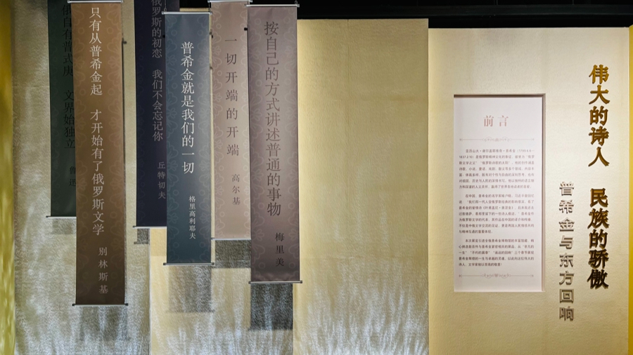 系列互動(dòng)裝置吸引讀者走進(jìn)普希金的文學(xué)世界,回顧其一生璀璨的創(chuàng)作成就。展覽入口處,一條條懸掛的語錄條幅上,書寫了多位文學(xué)評(píng)論家對(duì)普希金的贊譽(yù)。這些評(píng)語在3D動(dòng)態(tài)水紋燈的映襯下,宛如通往詩(shī)人世界的導(dǎo)引,為觀眾開啟一場(chǎng)跨越時(shí)空的對(duì)話。高爾基稱之為“一切開端的開端”,丘特切夫評(píng)價(jià)其是“俄羅斯的初戀 我們不會(huì)忘記你”,別林斯基說“只有從普希金起 才開始有了俄羅斯文學(xué)”,格里高里耶夫甚至驚呼“普希金就是我們的一切”……