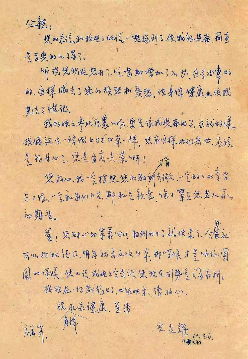 您放心,我一定按照您的教育去做,一定好好的(地)學(xué)習(xí)與工作,一定和每個(gè)同志都和氣親愛,絕不辜負(fù)您老人家的期望。