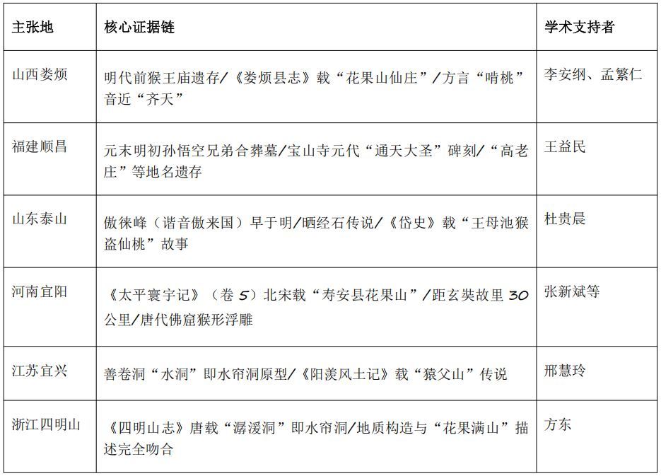 關(guān)于花果山的原型,學(xué)界有不同觀點(diǎn),現(xiàn)將幾種學(xué)說(shuō)譜系列表如下: