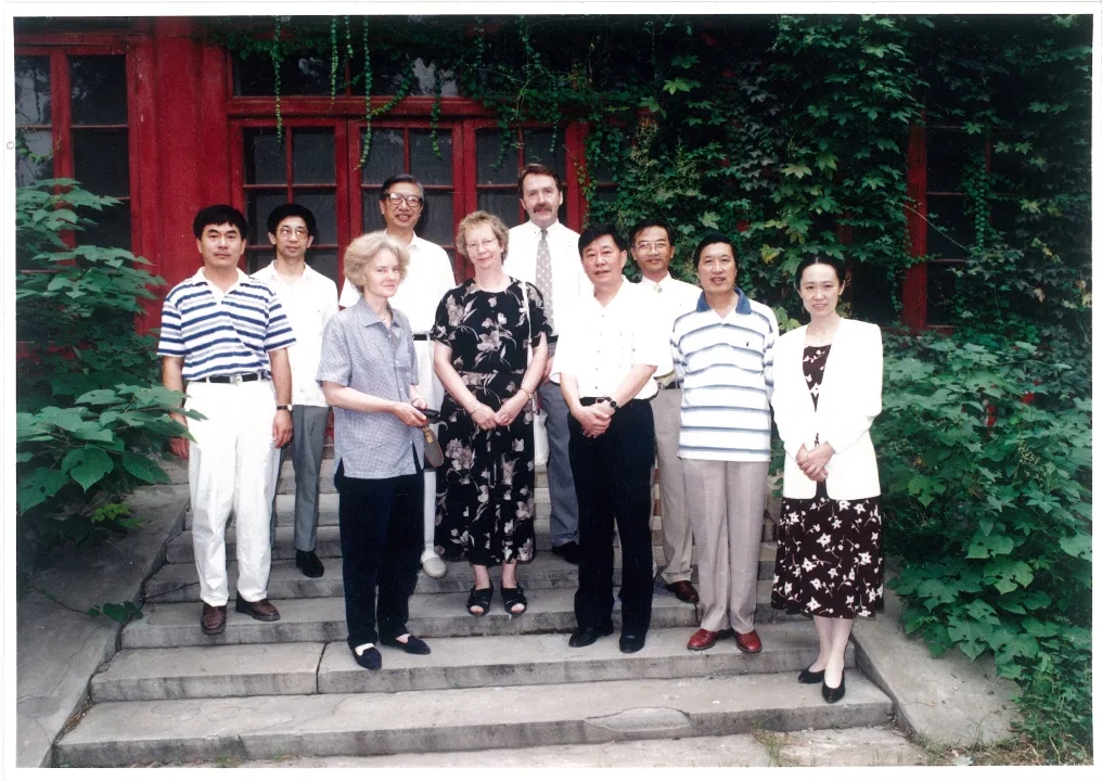九十年代初,在文學(xué)館舊址萬壽寺與館長(zhǎng)舒乙(前排右三)、副館長(zhǎng)吳福輝(后排左三)、周明(右二),及館員于潤(rùn)琦、劉屏(后排左一二)接待外國(guó)學(xué)者