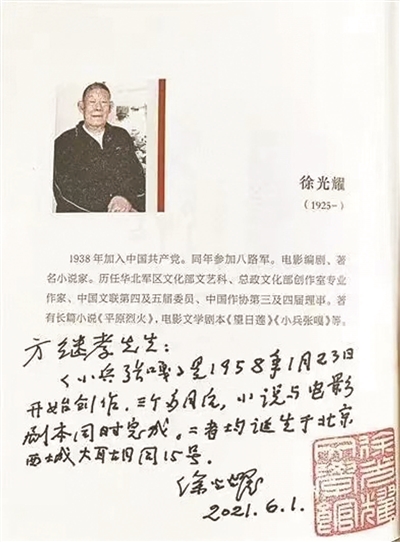 方繼孝回憶,他與徐光耀先生在30年前開始交往,并結(jié)下忘年交。起初引起他注意的是徐光耀1958年日記里的一句話,“從今天起,開始寫中篇小說劉故得兒的故事?!比沼涀詈筮€有一句話,“張故得兒的故事已經(jīng)完成初稿?!狈嚼^孝知道“故得兒”這詞在北京話里是“老疙瘩”“老兒子”的意思,在河北方言里還有調(diào)皮搗蛋的意思。《小兵張嘎》究竟是在哪里孕育出生的?方繼孝后來研讀《徐光耀日記》發(fā)現(xiàn),小說《小兵張嘎》初擬提綱時(shí)的名字叫“劉故得兒”。梗概完成后,改為“張故得兒”。最后定稿時(shí),書名《小兵張嘎》。2021年,徐光耀在紀(jì)念《小兵張嘎》公開發(fā)表60周年海報(bào)簽字并附贈(zèng)手書時(shí),向方繼孝確認(rèn),《小兵張嘎》是1958年1月23日開始創(chuàng)作,在北京西城延壽寺街的大耳胡同15號(hào)完成的。