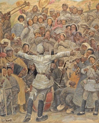 戰(zhàn)爭可以摧毀肉體,卻不能奪走對精神家園的守望。而這份堅(jiān)韌,終將使人性的火種于戰(zhàn)爭的鐵血洪流中得以頑強(qiáng)存續(xù),并轉(zhuǎn)化為民族不屈不撓、勇往直前的澎湃動(dòng)力。在抗戰(zhàn)美術(shù)畫卷中,還有另一種重要筆觸,記錄戰(zhàn)爭至暗時(shí)刻里的光明心火,以見證黎明必至的希望和夢想。如邢慶仁的《玫瑰色的回憶》和高云的《還記得我們嗎》兩幅作品,都刻畫了年輕的八路軍、新四軍女戰(zhàn)士。她們身姿挺拔,戎裝陳舊卻整潔,充滿活力與憧憬,特別是軍帽之下那些紛揚(yáng)散落的碎發(fā),如青春靈動(dòng)的無聲訴說,提醒人們縱使烽火連天,也不能掩蓋她們花樣年華的芬芳,更無法奪走她們追求美的執(zhí)著。沈堯伊的《在太行山上》,描繪了軍民共奏歡歌的動(dòng)人場面。畫面正中,一位八路軍戰(zhàn)士正在指揮大家演奏,其張開的雙臂像要托起每個(gè)人的和平夢想。在此,樂器與武器并置、山谷與旋律共鳴,軍民一起享受精神世界的豐饒。竇培高的《微山湖上靜悄悄》,捕捉了五位戰(zhàn)士在蘆葦蕩中短暫休憩的場面。戰(zhàn)士們有的凝望遠(yuǎn)方、有的彈琴吟唱、有的警惕四顧,但他們手中的槍和土琵琶都被微山湖的夕陽鍍上了溫柔的金色,正可謂:鐵血與溫情交織,劍膽與琴心并存。