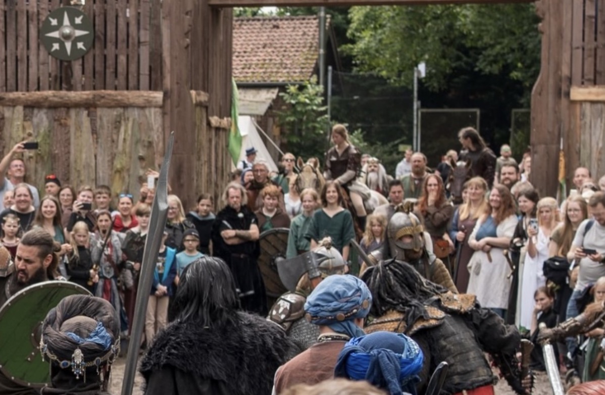 五月末,我抵達(dá)德國北威州的Geldern,正逢一年一度的托爾金節(jié)。下火車后,我步行穿過一片林地,遠(yuǎn)遠(yuǎn)地看見草地上升起了帳篷,煙火繚繞,有人在河邊磨面,有人在棚下用古式木工打造手斧,有孩子身著霍比特服飾在泥地上追逐。一時間,我并不覺得自己“進(jìn)入了中土”,而是仿佛走進(jìn)了一場確實存在于歷史里的村落節(jié)慶,沒有現(xiàn)代音樂,沒有熒光色,沒有塑料。只有火堆、吟唱、木頭、弓箭,以及手寫的精靈語標(biāo)牌,認(rèn)真的,不容嘲諷的。