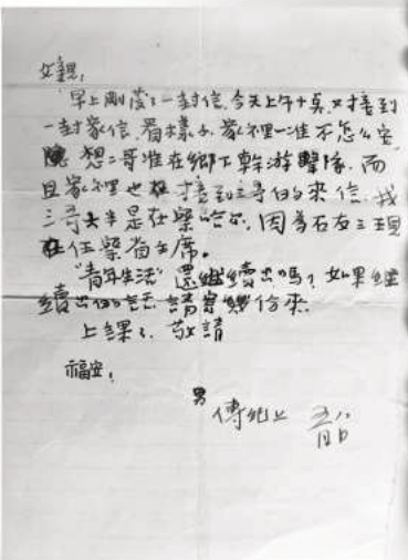 父親:早上剛發(fā)了一封信,今天上午十點(diǎn),又接到一封家信。看樣子家里一準(zhǔn)不怎么安(穩(wěn)),想二哥準(zhǔn)在鄉(xiāng)下干游擊隊(duì),而且家里也接到三哥的來信。我三哥大半是在察哈爾,因?yàn)槭讶F(xiàn)在任察省主席?!扒嗄晟睢边€繼續(xù)出嗎?如果繼續(xù)出的話,請寄幾份來。上課了,敬請福安!