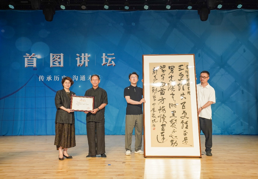 分享會(huì)后,吳悅石對(duì)出席發(fā)布會(huì)的社會(huì)各界嘉賓表示感謝,他強(qiáng)調(diào)石鼓文乃中華文明經(jīng)典瑰寶,素有“籀篆之祖”之譽(yù),批注石鼓文實(shí)因書(shū)畫(huà)研習(xí)所需——學(xué)書(shū)習(xí)畫(huà)必溯石鼓。然初學(xué)時(shí)苦于字形難辨、文意難解,遂決意逐字考釋。幸遇文字學(xué)、考古學(xué)新成果涌現(xiàn),終能以今人可解之語(yǔ)完成批注。惟愿后學(xué)能看懂、學(xué)通石鼓文。今歷經(jīng)十年書(shū)稿問(wèn)世,絕非個(gè)人之功,實(shí)乃古文字學(xué)界滋養(yǎng)使然。愿此書(shū)能引諸君沉潛經(jīng)典:于坐臥行止間認(rèn)真體悟,以身心相印的功夫深研傳統(tǒng)?;顒?dòng)的最后,吳悅石先生將書(shū)法作品《勸學(xué)·顏真卿》捐贈(zèng)給首都圖書(shū)館,為這場(chǎng)兼具深度與溫度的文化盛宴畫(huà)上圓滿句號(hào)。