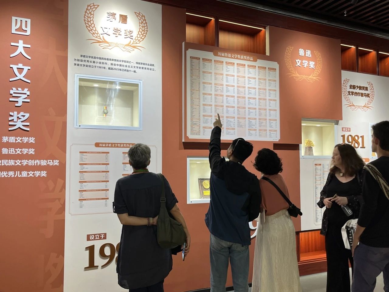 下午,大家來到中國當(dāng)代作家簽名版圖書珍藏館,這里展陳的500余位中國作家的1000余冊文學(xué)圖書、百余份手稿,充分展示了我國文學(xué)事業(yè)的輝煌成就?!霸谝粋€(gè)村莊有這樣規(guī)模和品質(zhì)的文學(xué)展覽真是嘆為觀止”,土耳其漢學(xué)家吉來感嘆說。在茅盾文學(xué)獎(jiǎng)獲獎(jiǎng)作品展區(qū),漢學(xué)家們爭相指著陳列的獲獎(jiǎng)作品《平凡的世界》《長恨歌》《生命冊》《本巴》等,激動不已地表示這是他們翻譯過的作品,還時(shí)不時(shí)就各自熟悉的作家作品相互交流起來。