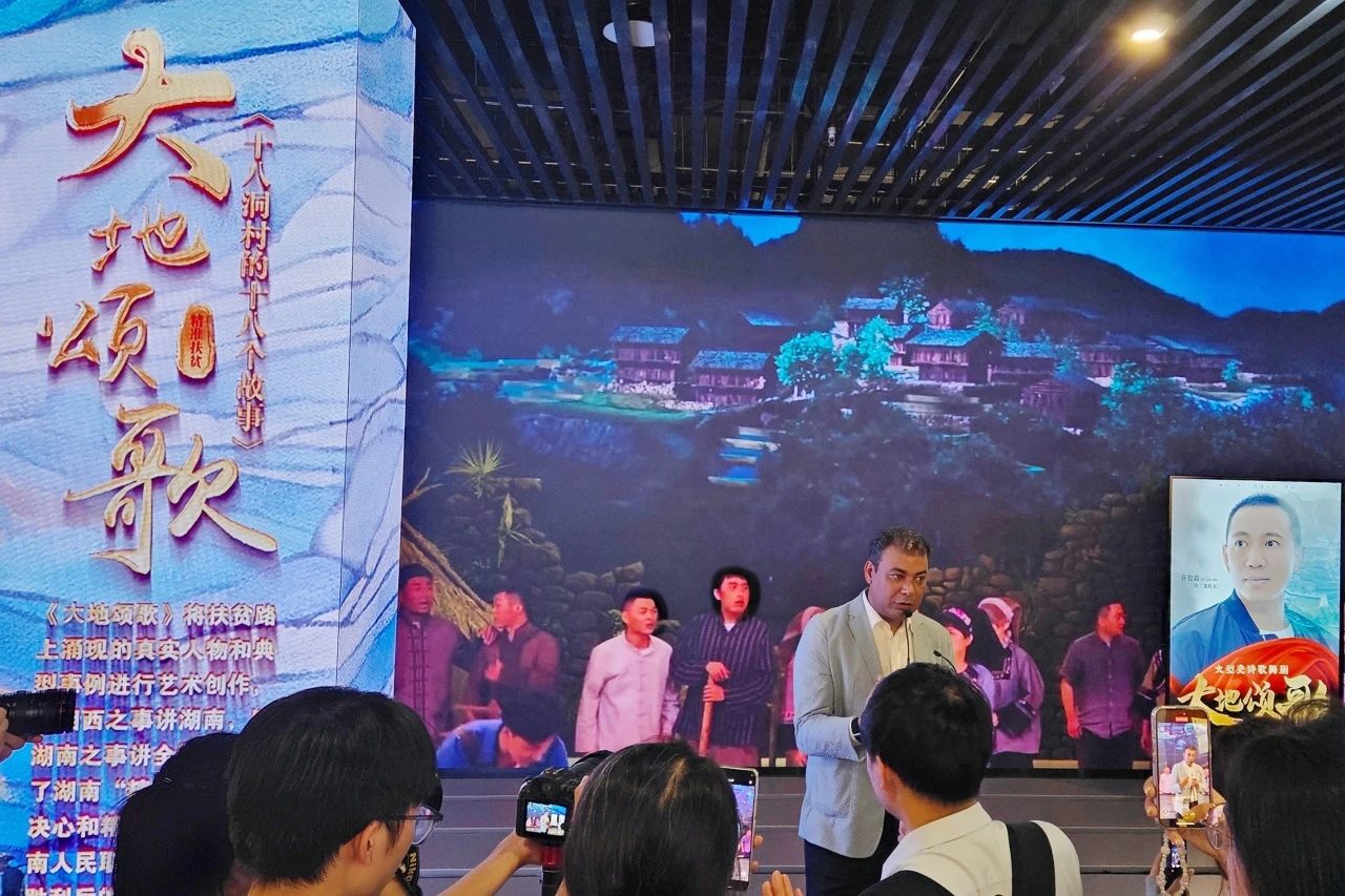 埃及漢學(xué)家白鑫驚喜地看到館內(nèi)展示的以湖南湘西十八洞村脫貧攻堅(jiān)為原型的歌舞劇《大地頌歌》,他曾翻譯過同一題材的《十八洞村的十八個(gè)故事》。“阿拉伯國家好像沒有類似的報(bào)告文學(xué)。我翻譯十八洞村的故事翻譯了很久,要查很多資料。這本書告訴世界,中國是怎么做脫貧工作的,在埃及翻譯出版后,反響很大,感染了很多讀者?!卑做伪硎荆灿信d趣將這個(gè)舞臺劇翻譯介紹到阿拉伯國家。
