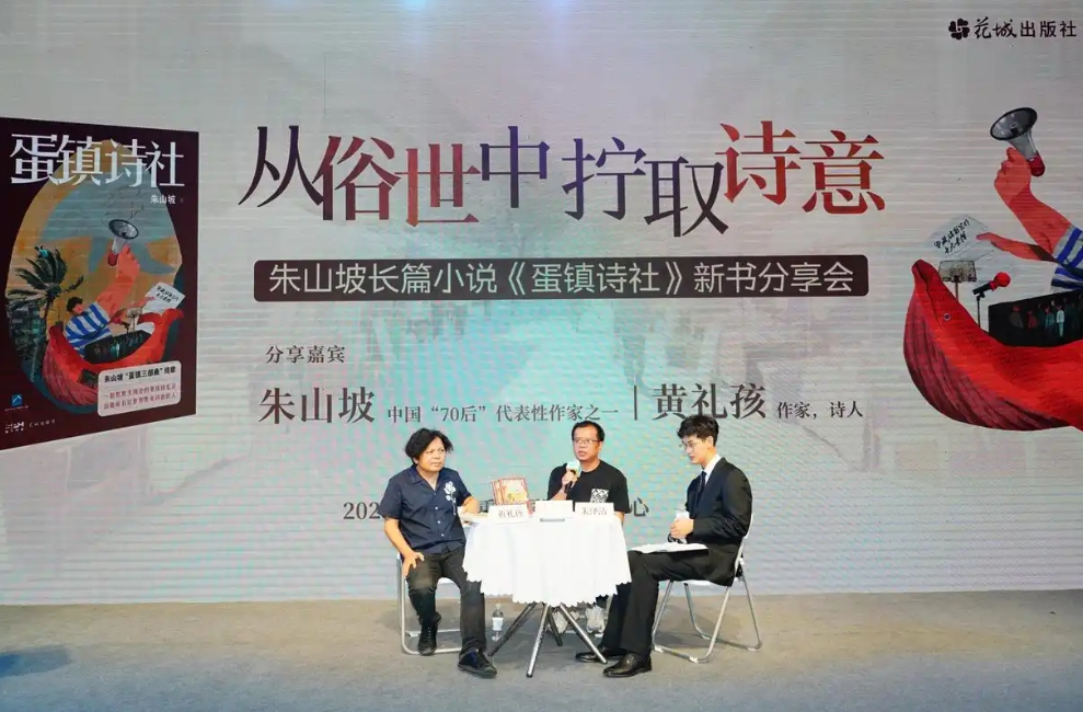 7月26日,第33屆全國(guó)圖書(shū)交易博覽會(huì)期間,朱山坡長(zhǎng)篇小說(shuō)《蛋鎮(zhèn)詩(shī)社》新書(shū)分享會(huì)舉辦。本次分享會(huì)由花城出版社舉辦,特邀詩(shī)人黃禮孩與作者朱山坡圍繞“從俗世中擰取詩(shī)意”的主題展開(kāi)關(guān)于新書(shū)內(nèi)容的對(duì)談?;ǔ浅霭嫔绺笨偩庉嫛ⅰ峨S筆》雜志主編陳賓杰出席活動(dòng)。