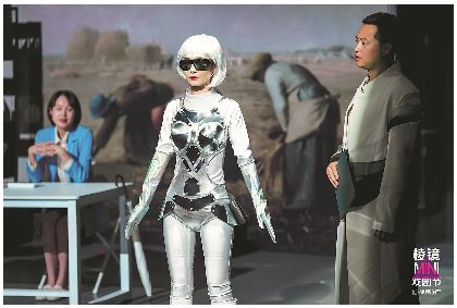 這種敘事性肢體表演給人以特別的驚艷感。以肢體表演完成敘事和抒情,這是一種純屬于戲劇的藝術(shù)手段。由活生生的演員完成的這種帶有抽象色彩的表現(xiàn),也是AI題材電影所難以營(yíng)造的舞臺(tái)詩(shī)意。