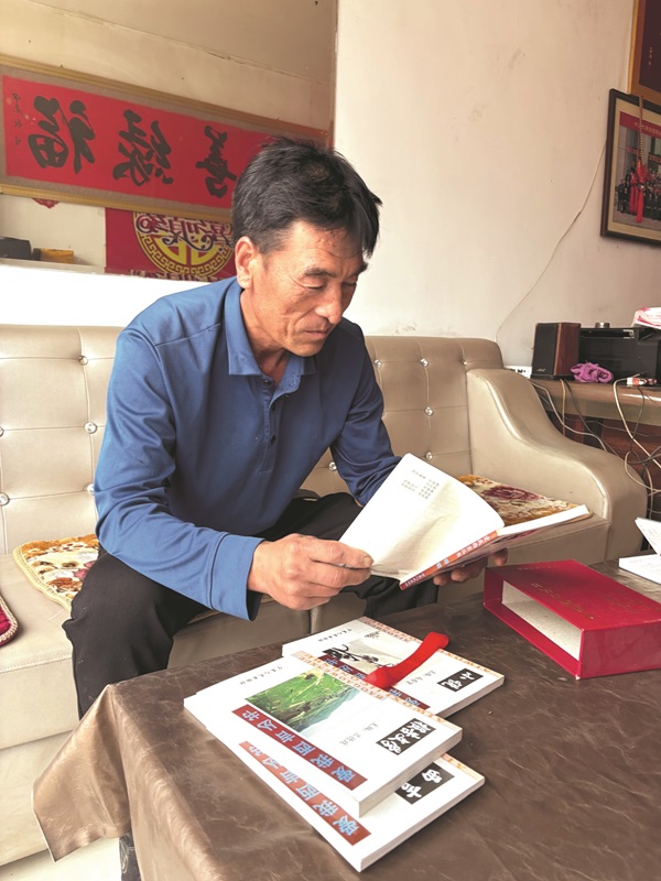 咸存福的家有一個四四方方的小院,院內(nèi)綠樹掩映。然而,步入略顯簡樸的客廳,屋內(nèi)的景象卻令人印象深刻。房間左側(cè),倚墻而立的是半面墻的書柜和一張書桌。桌上,一臺筆記本電腦的觸控板兩側(cè),被長期使用磨出了兩個極其醒目的油亮手印,無聲訴說著主人的勤奮。與之相對的房間右側(cè),一個書架上整齊陳列著從第一屆到第十屆的所有茅盾文學(xué)獎獲獎作品。面對記者,咸存福和他的父親咸順利分享了他們的故事。