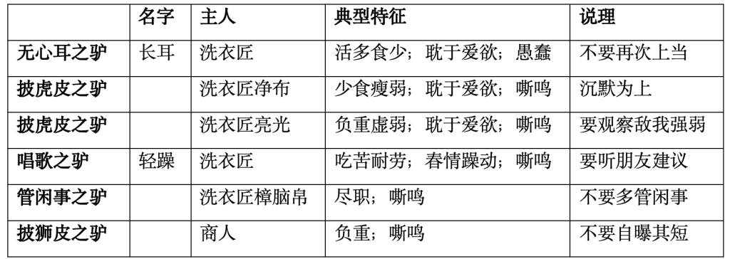 《伊索寓言》中有十幾個關(guān)于驢的故事,在內(nèi)容的豐富性上遠(yuǎn)勝印度,驢的形象也更加多元。其中,一個情節(jié)類似的故事是“驢和獅子皮”:驢披上獅皮嚇唬眾獸,狐貍因聽過其叫聲而看破其身份。其余有關(guān)驢的故事大體可分為數(shù)類: