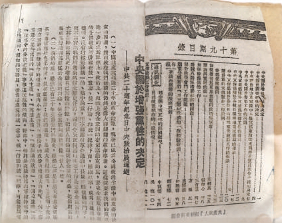 《共產(chǎn)黨人》是1939年10月在延安創(chuàng)辦的中共中央理論刊物,毛澤東為該刊題寫刊名“共產(chǎn)黨人”,并撰寫了發(fā)刊詞。雜志每月出版一期,總編輯為張聞天,編輯主任為李維漢,主旨為統(tǒng)一全黨思想、明確政治方向、鞏固黨的組織等?!豆伯a(chǎn)黨人》于1941年8月終刊,共出了19期。武光這本《共產(chǎn)黨人》就是第19期,扉頁上的“共產(chǎn)黨人”四個(gè)字極為顯著,左側(cè)印有“一九四一年八月出版”,目錄之后的首篇文章是《中央關(guān)于增強(qiáng)黨性的決定》。