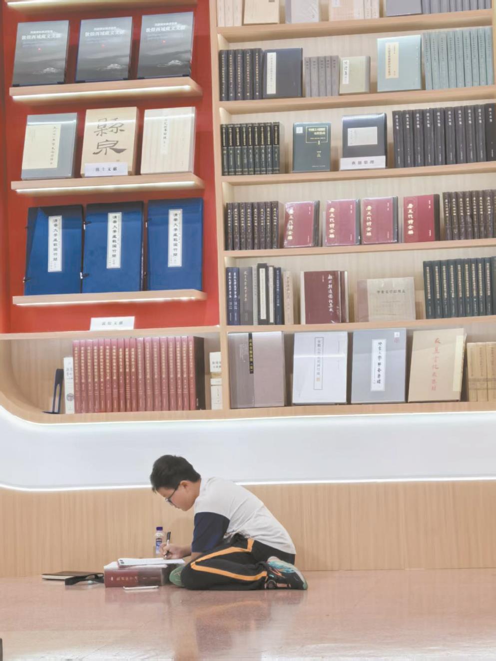 上海世紀(jì)出版集團(tuán)精品展區(qū),12歲少年汪宏嘉席地而坐,伏在厚重的《敦煌學(xué)大辭典》(第二版)上專注抄錄,筆尖沙沙作響,于周身喧囂中辟出一方靜土。鏡片后專注的眼神,紙頁(yè)間流利的字跡,小小身影定格了2025上海書(shū)展令人動(dòng)容的一幕。