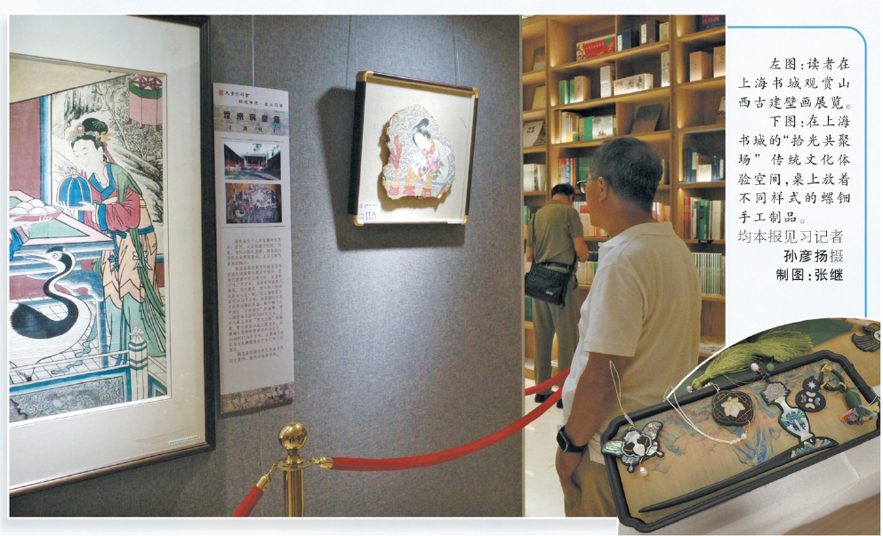 左圖:讀者在上海書城觀賞山西古建壁畫展覽。下圖:在上海書城的“拾光共聚場”傳統(tǒng)文化體驗空間,桌上放著不同樣式的螺鈿手工制品。均本報見習記者孫彥揚攝