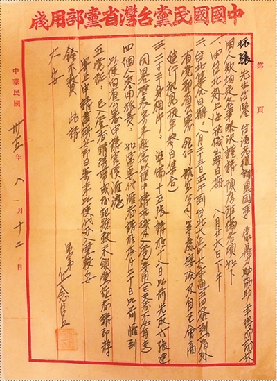 從1946年6月起,丘念臺奔走于各市縣,邀集各地知名人士15人組成“謝恩團”,由省議員林獻堂擔任團長。此信就是“謝恩團”臨行前夕,丘念臺為籌劃安排出發(fā)事宜給臺灣抗日義士姜紹祖之子、新竹縣參議員姜振驤所寫的信函。信中,從出發(fā)行程到團員個人資料準備,再到個人旅費匯寄,各項細節(jié)都做了精心安排。