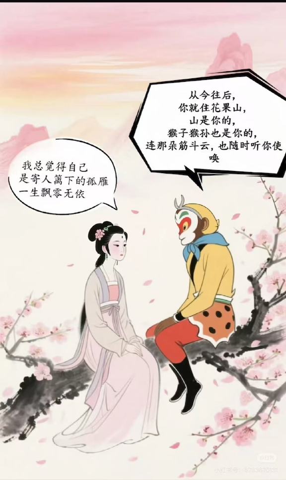 對(duì)于這一網(wǎng)絡(luò)現(xiàn)象,來(lái)自首都師范大學(xué)藝術(shù)與美育研究院的博士研究生凌正在本次紅學(xué)會(huì)年會(huì)上進(jìn)行了探討。在他看來(lái),這種二創(chuàng)采用碎片化敘事策略:通過(guò)剪輯《西游記》《紅樓夢(mèng)》影視片段并配旁白,構(gòu)建了四類敘事——神話羈絆(絳珠仙草與補(bǔ)天石)、門當(dāng)戶對(duì)(國(guó)民級(jí)主角)、性格互補(bǔ)(黛玉敏感細(xì)膩vs悟空直率熱忱)、互助解困(悟空改生死簿救黛玉/黛玉諷刺唐僧解圍悟空)。